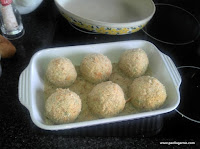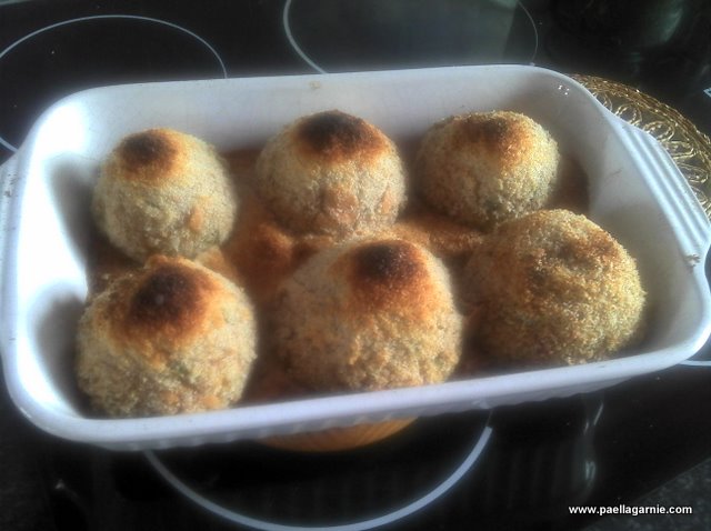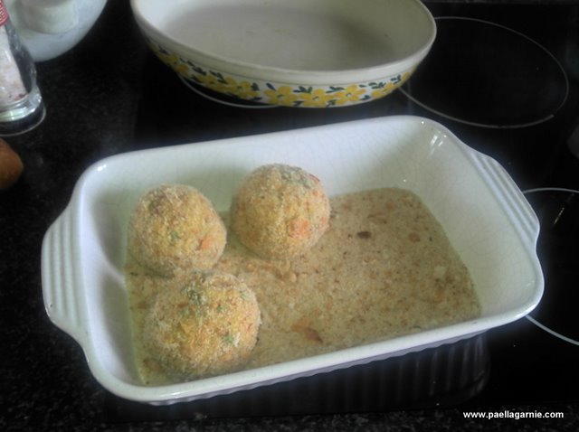 Déposez vos boules de riz dans un plat à gratin. Saupoudrez encore de panure.