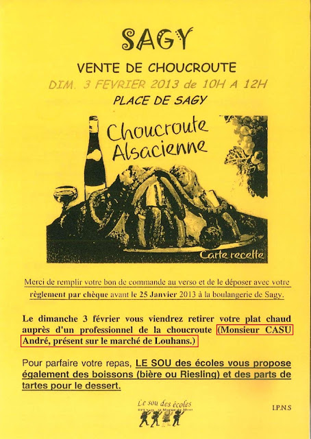 Dimanche 3 février 2013, choucroute à emporter à partir de 10h00, sur la place de Sagy